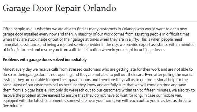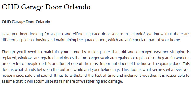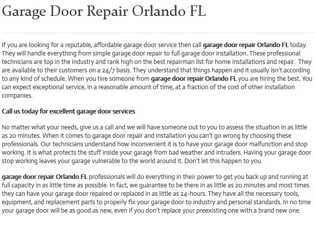 At Garage Doors Orlando FL professional technicians can handle any job your throw their way. There are multiple things that a professional repairman can do for your garage door needs. Whether large of small, they have the know-how and the means to get the job done in a timely manner and successfully. Some of the things these professionals offer are paint jobs and dent removal, repairing and/or replacing electronic mechanisms, full installation of garage door systems including garage door openers, weather stripping, and so much more. We offer our services to both residential and commercial customers. We are also available 24/7. This means whenever your garage door malfunction you can give us a call and we’ll send someone out right away to have a look at it.