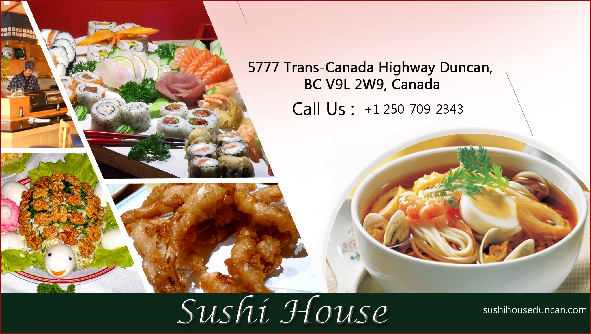 Sushi HOuse is one of the best Asian restaurant situated in Duncan, BC. We deliver quality Japanese food and delicate Japanese cuisine. If you are searching for a good Janpanese food and Pho soup in and around Duncan, here we are the best Japanese Restaurant serving pure asian food.