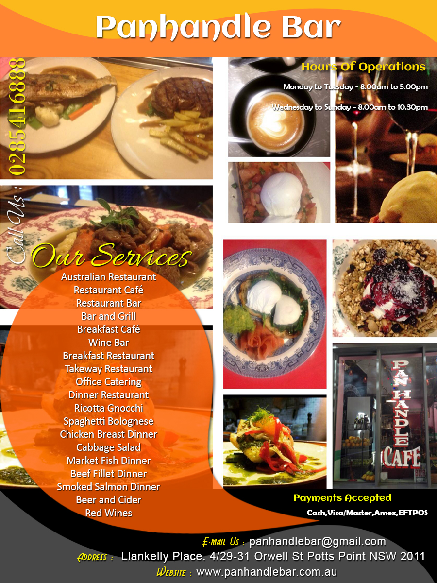 Boasting a full menu that spans breakfast right through to dinner, all meals are made to order with a range of gluten free options. Healthy home style dishes, constantly keeping organic crops, ethical whole foods etc., are the heart of their menu. Panhandle Bar is the leading Australian Restaurant eatery and a small bar showcasing the country's best biodynamic and artisan produce. Restaurant Café by day and Wine Bar by night, Panhandle bar is an intimate, eclectic Sydney small bar where only stellar seasonal produce is found. Panhandle bar's environmental awareness also extends to it's interior setting. As a footprint conscious venture, the café come bar is home to an eclectic range of recycled furniture.