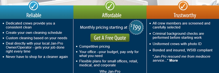 Jan-pro is a Edmonton cleaning company that provides janitorial and commercial cleaning services for a variety of industries and environment including healthcare, industrial, restaurant, retail, schools, offices, and much more! Our trained and certified staff are equipped with the latest technology to provide the highest cleaning service while still being environmentally friendly. Our commitment to providing great reliable janitorial services is second to none and we're so confident that our services come with a 100% satisfaction guarantee. Contact us today to learn more!