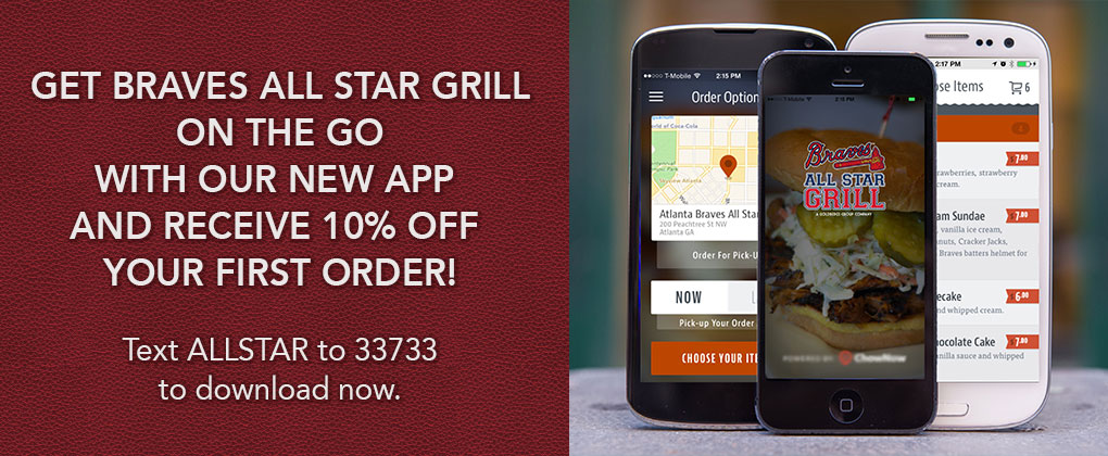 The Braves All Star Grill represents the intersection of Atlanta heritage. The Atlanta Braves has long been Atlanta’s beloved World Series winning baseball team, now teamed with the Goldbergs Group, the same company behind Goldbergs Bagels to bring a one of a kind dining experience to downtown in the historic 200 Peachtree building. The heritage of these Atlanta brands brings something truly awe inspiring to the world of the casual sports bar. The Braves All Star Grill occupies 8,000 square feet filled with unique Braves memorabilia and enormous video screens making it the perfect place to watch your favorite team and have a great meal with friends and family. Our chef inspired menu and full bar featuring signature house cocktails offer something delicious for everyone. Try your arm in the real life pitching cage and see how your fastball is doing while entertaining your friends. Our dugout is the perfect option for one of a kind private dining events. The Braves All Star Grill isn’t a sports bar. It’s the sports bar. For all these reasons and so many more that you can only see in person the Braves All Star Grill is already an Atlanta Institution.