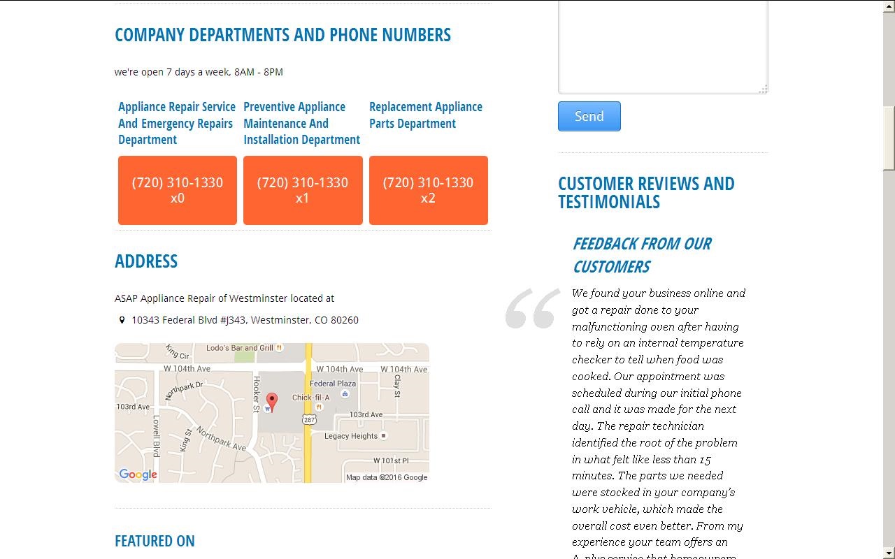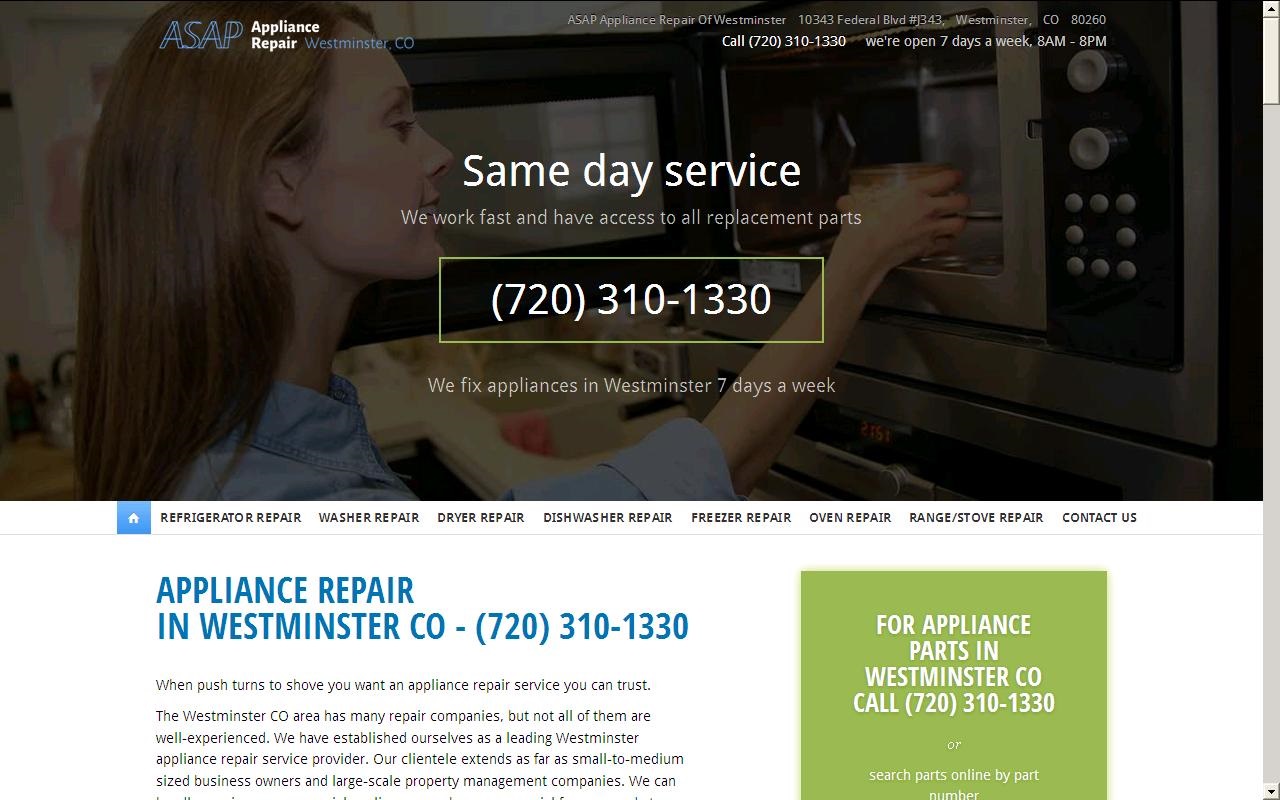 Ring up (720) 310-1330 and conversate with one of our appliance repair technicians in Westminster, CO area today. Get $20 off your first repair with us immediately!