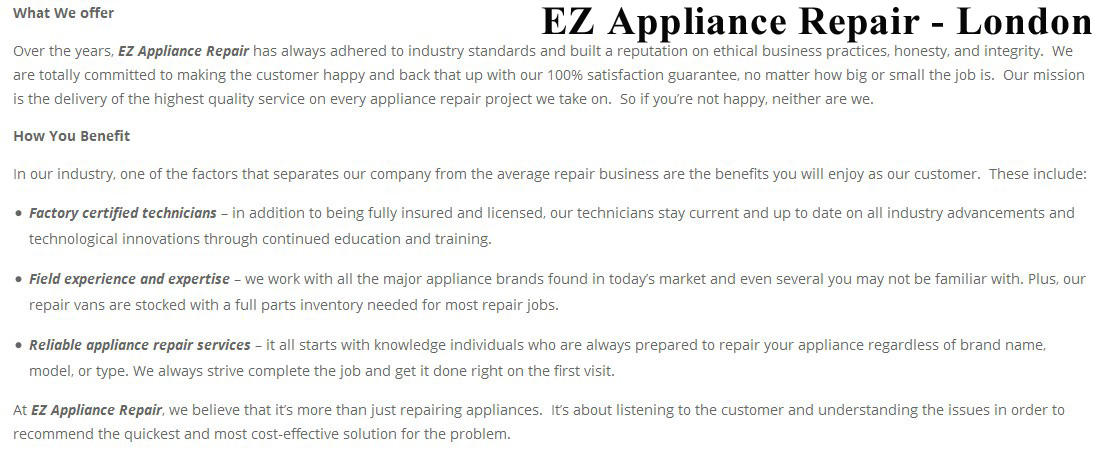 Whether you are considering appliance repair in London, Ontario or planning to contact a microwave oven repair service, you need to call EZ Appliance Repair. As one of the most reliable and trusted services, we serve the residents and commercial establishments in the province of Ontario.