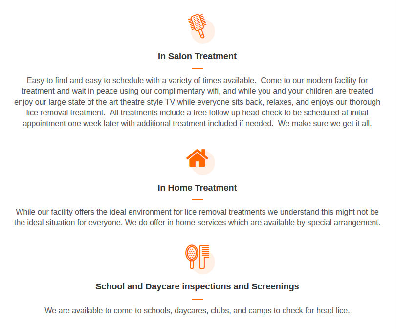 Additionally, we offer a range of lice treatments at the salon and in-home. However, we take on screening and inspections at schools and at daycares. We offer FREE follow-up of head checks 1 week after the treatment and continue the treatment, if infestation persists. Call us today to schedule an appointment and enjoy discounts and deals!
