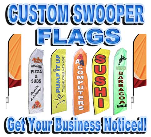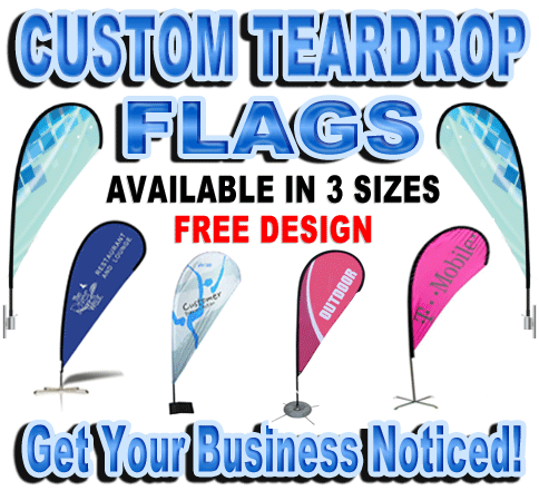 We offer discount pricing on Custom Vinyl Banners and Custom Mesh Banners. We also offer a variety of custom advertising flags as well including Swooper Flags, Custom Feather Flags, and Custom Teardrop Flags. Customize your banner or flag with your company’s logo and message in our online design center or let us design it for FREE.