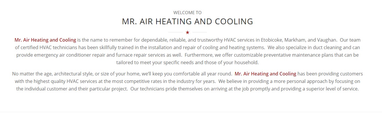 Whether you need new HVAC installed/repaired, ducts cleaned or need preventive maintenance plans, call Mr. Air Heating and Cooling. Our HVAC service in Etobicoke has been in business for years. We have a team of highly skilled technicians to look at all aspects of your HVAC unit. Each of the technician working with us is certified, factory trained, licensed and insured. Additionally, we are available to work on any brand and size of HVACs. From furnace repair in Etobicoke to complete work on HVAC system for residential and commercial projects, we excel at it. Offering quick AC Repair in Etobicoke with cost effective and 24/7 availability, we ensure that you have professionals available anytime you need us.