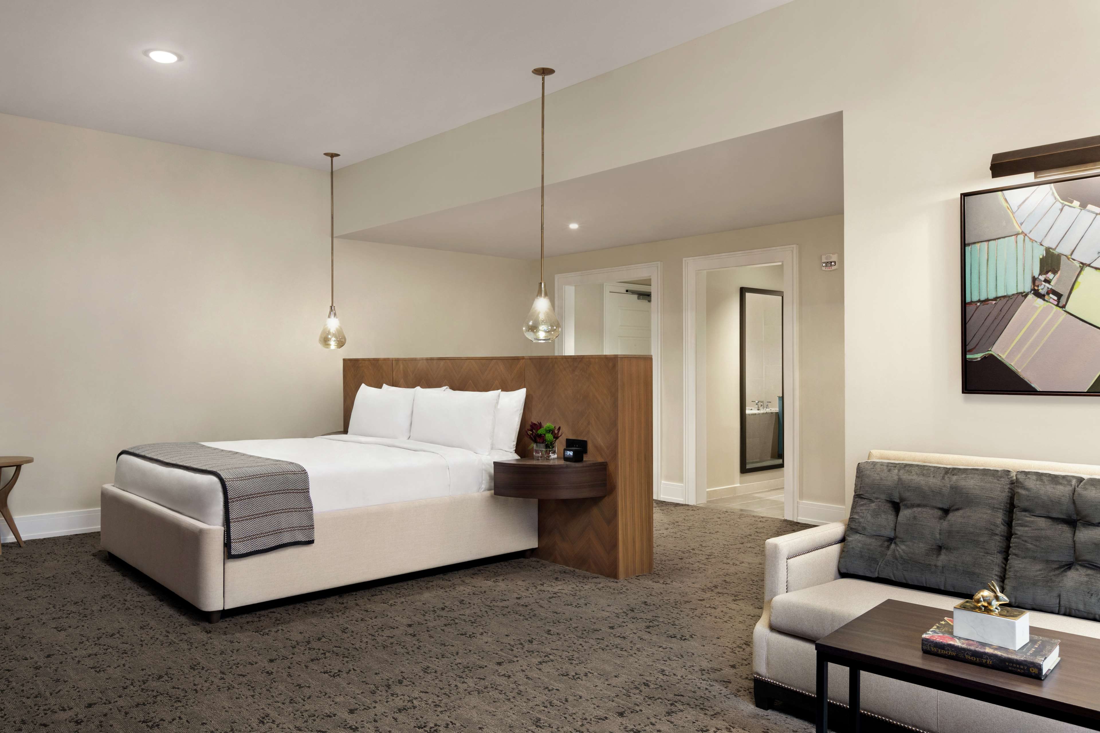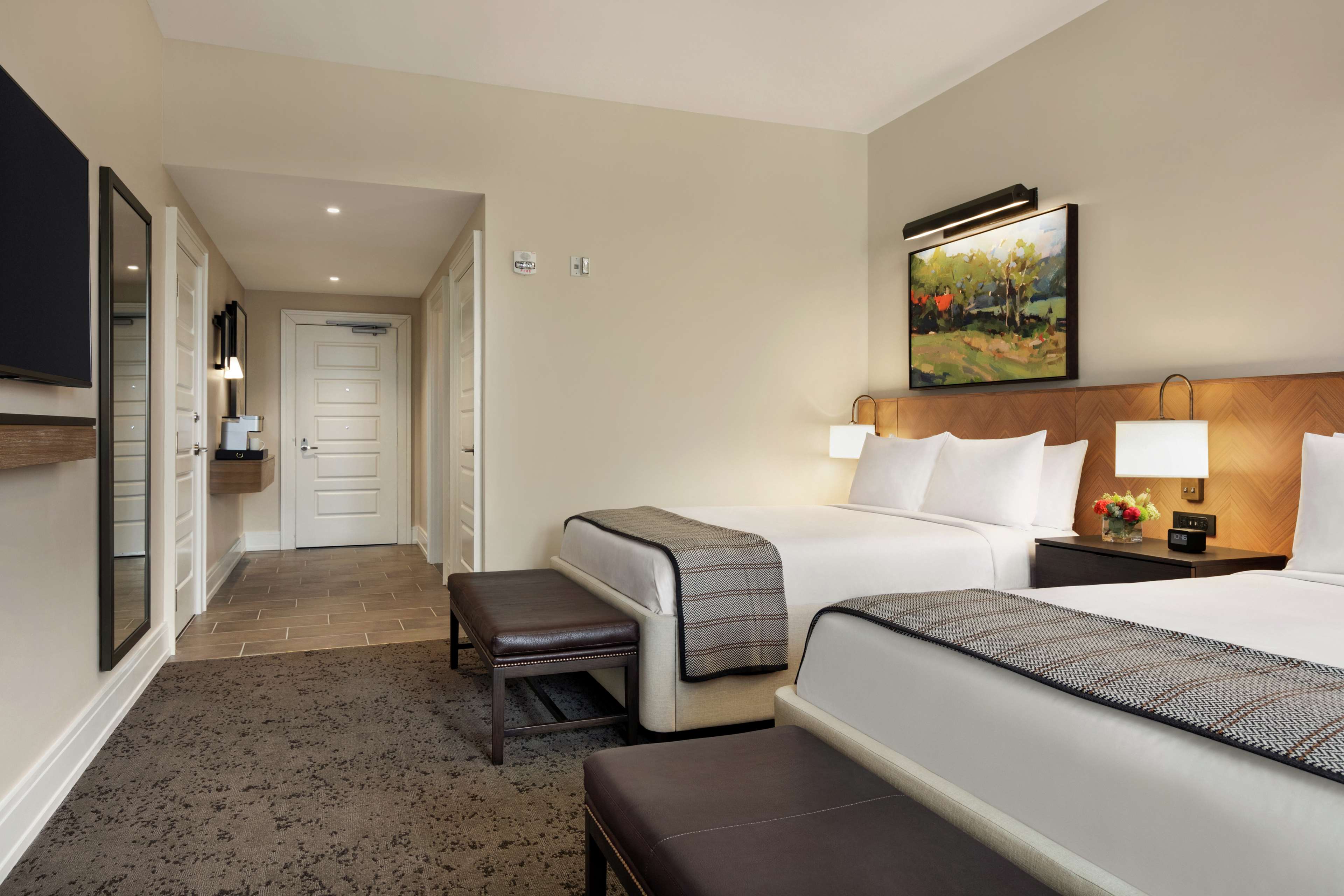 Unwind in our elegantly appointed guest rooms, featuring one king or two queen beds with views of historic Franklin and/or our tranquil courtyard. Our rooms combine a timeless décor with subtle touches of Franklin’s history and the modern comforts of today. Enjoy our 55-inch HDTVs, TVs, in-room coffee, WiFi, flexible workspace, robes, slippers, oversized bathrooms, and closets. We’re pleased to welcome your furry family members in our pet-friendly rooms.