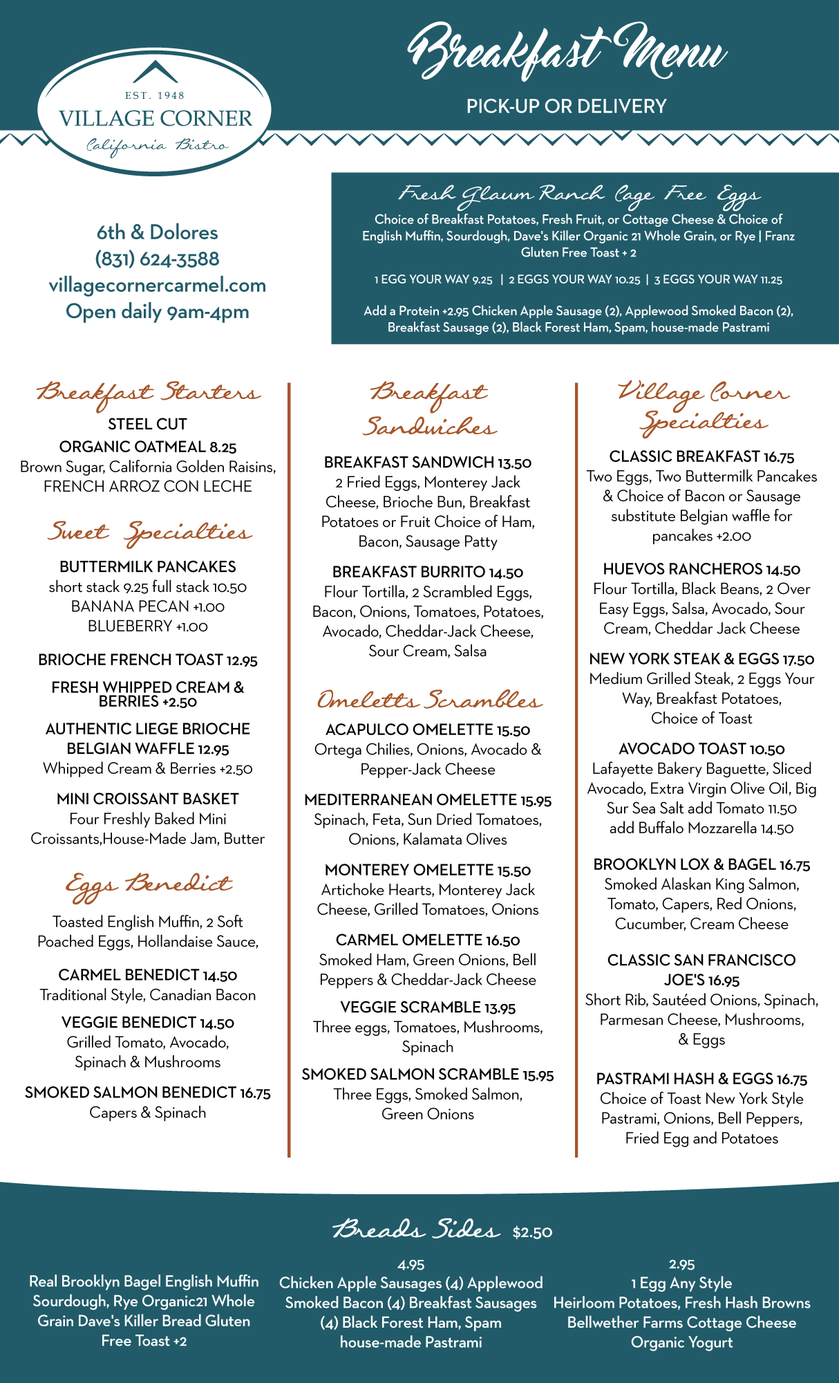 Established in 1948, Village Corner California Bistro is a dining institution in Carmel-by-the-Sea that locals and travelers have been frequenting for decades. Experience the subtle changes to our menu as we work to carry on the tradition guests have enjoyed for decades.