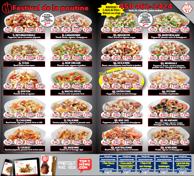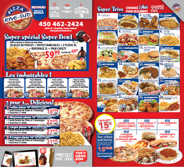 Located in Saint Hubert, QC, PIZZA-RIVESUD has seen 17 years of serving food and delivered them to the houses of the customers. We serve Pizza, Hamburger (homemade bread), salads, sandwiches, chicken breast; poutine (20 choices) and we can deliver all the foods to your house