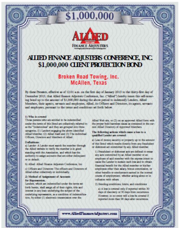 "One stop" call for towing and repossession needs. We are equipped with wheel lift, rollback and hideaway wreckers. We can easily load a vehicle from a crowded parking lot or recover a vehicle from a remote farm road. We pride ourselves on using safe, state of the art equipment. This commitment benefits our clients because we can offer quick, safe, damage free recovery of your vehicle. We carry the most progressive insurance coverage offered in the industry through Walt C. Cagley Insurance Agency, as well as a $1,000,000 client protection bond through Allied Finance Adjusters.