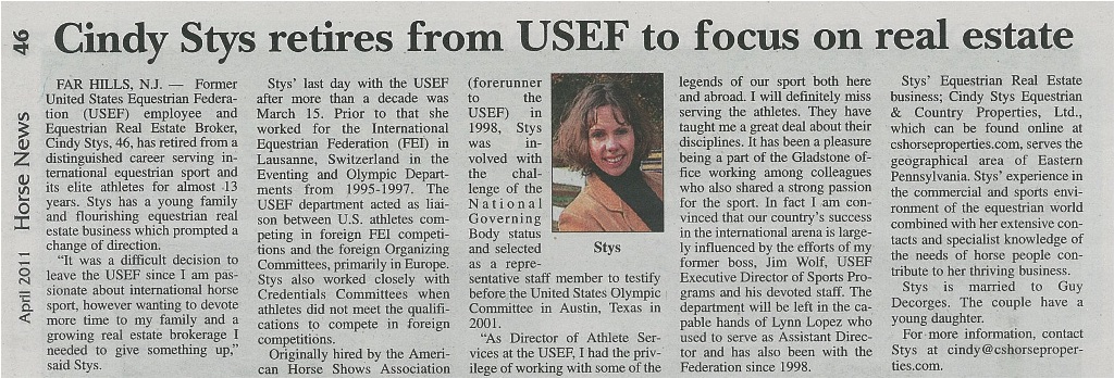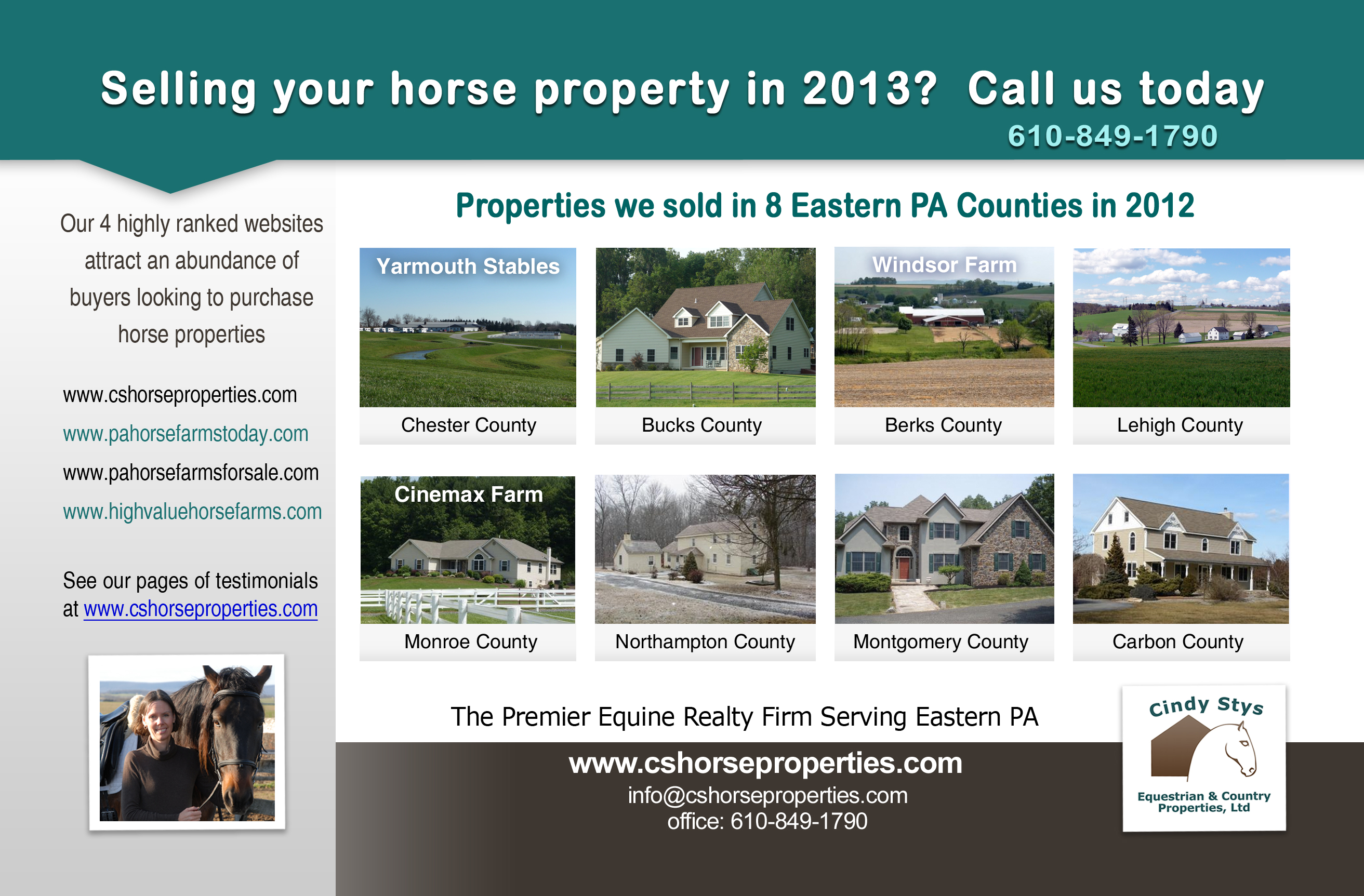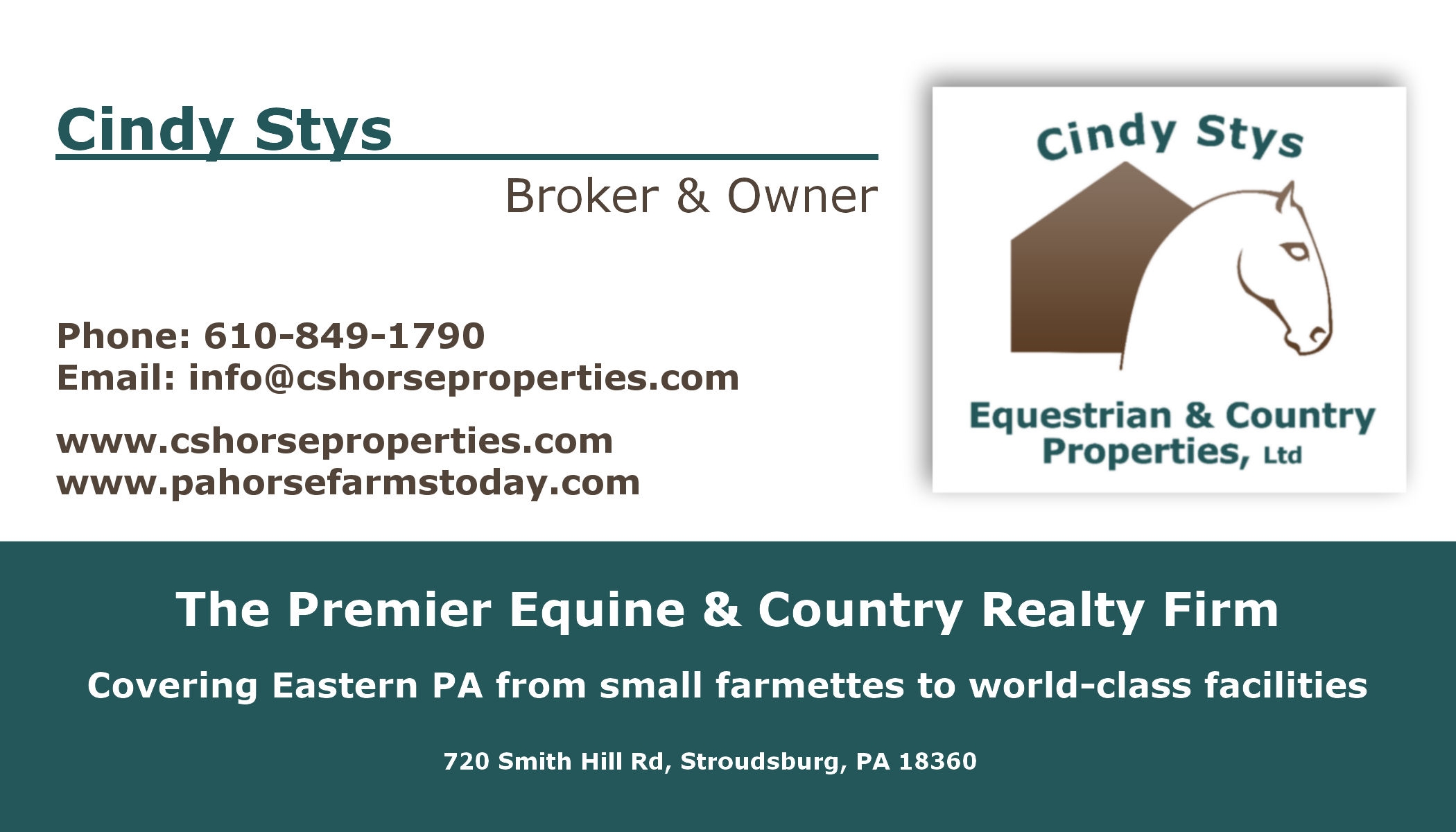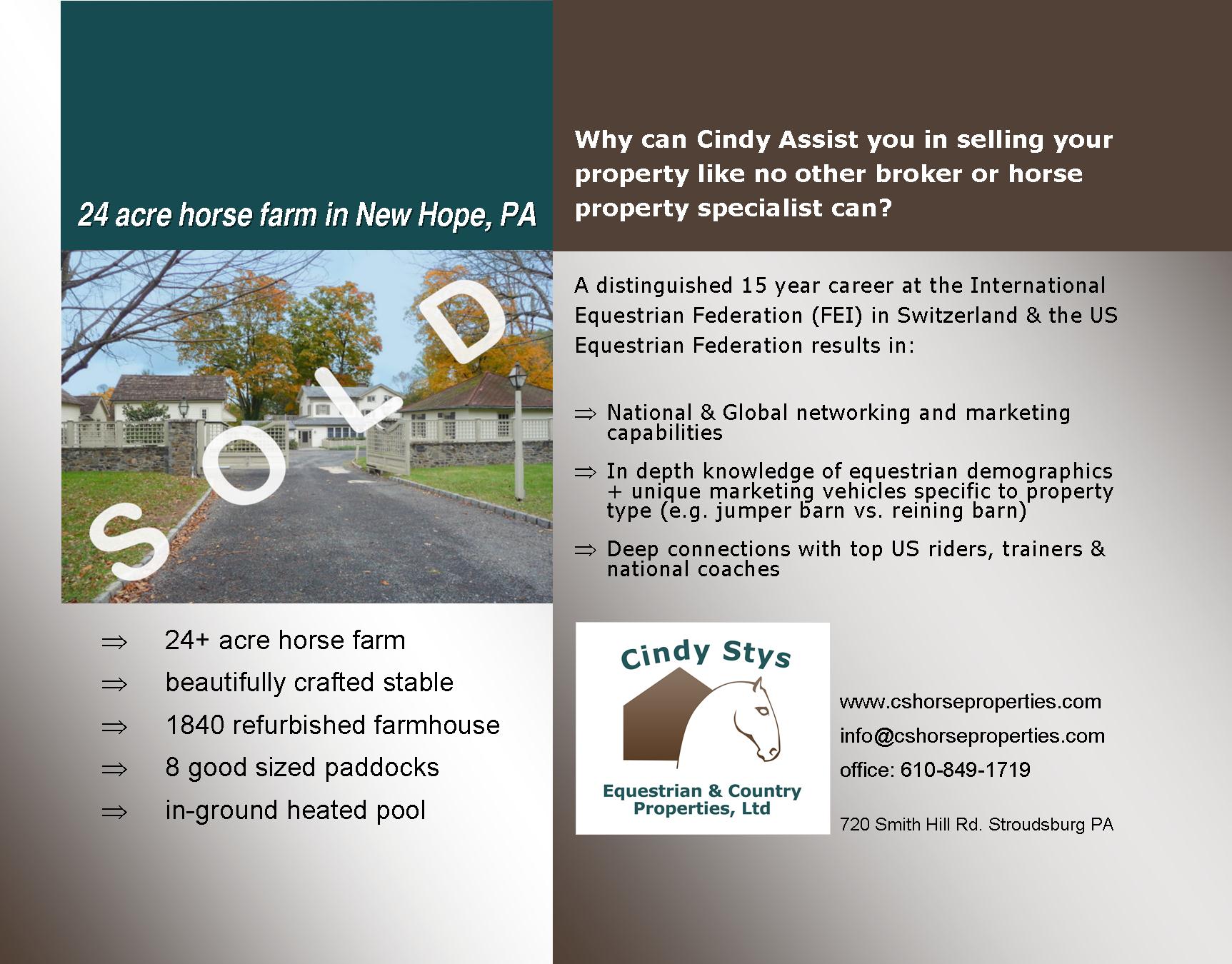 Cindy Stys Equestrian & Country Properties, Ltd is dedicated to the marketing and sales of equestrian and country properties in Eastern Pennsylvania. It consolidates area properties suitable for having horses (from backyard to state-of-the-art operations) and focuses on this property type. Unlike other real estate companies that handle a variety of properties, our razor-sharp focus, knowledge of the inventory, and sensitivity to equestrian needs never go uncompromised. We belong to 3 powerful MLS systems serving 15 counties in Pennsylvania, 21 in New Jersey as well as counties in the states of Maryland and Delaware. A boutique real estate firm, Cindy Stys Equestrian & Country Properties, Ltd, was created by a passionate member of the “equestrian family” to serve other “members” of this unique family.