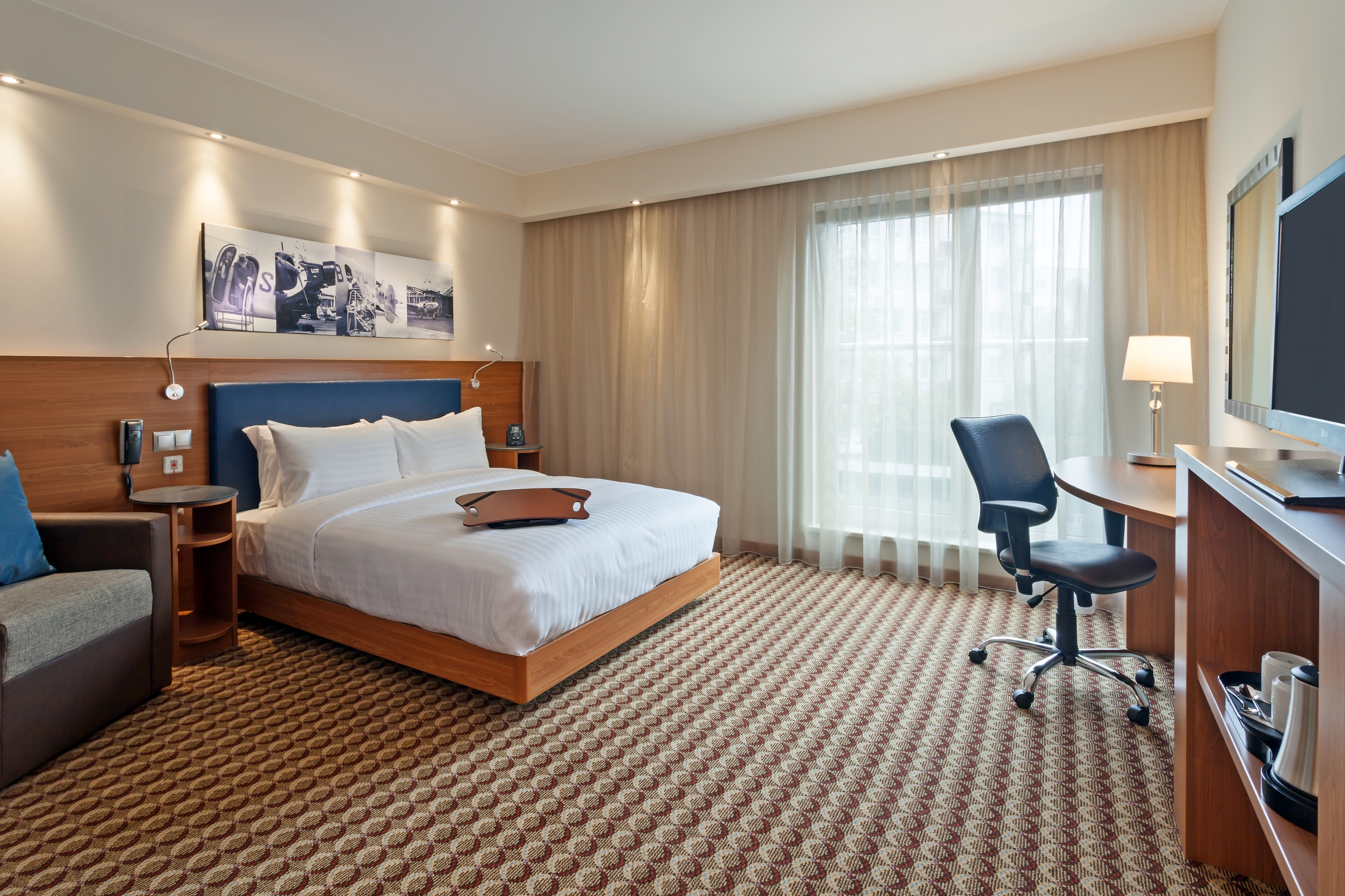Delicious hot breakfast and unlimited WiFi are included in each stay. Bright, well-appointed bedrooms at this Warsaw airport hotel feature a large comfy bed, HDTV, soft tub chair, workspace, lap desk and coffee set. Upgraded options add a pull-out sofa bed. On-premise facilities, such as a coffee/cocktail bar, snack shop, gym and business center, operate around the clock. Guests can also take advantage of modern meeting space for up to 35 delegates. Hold a successful Warsaw event in the flexible 47 sq. m. conference room and stay connected in the free-to-use business center, offering a range of services and amenities at this Chopin Airport hotel.