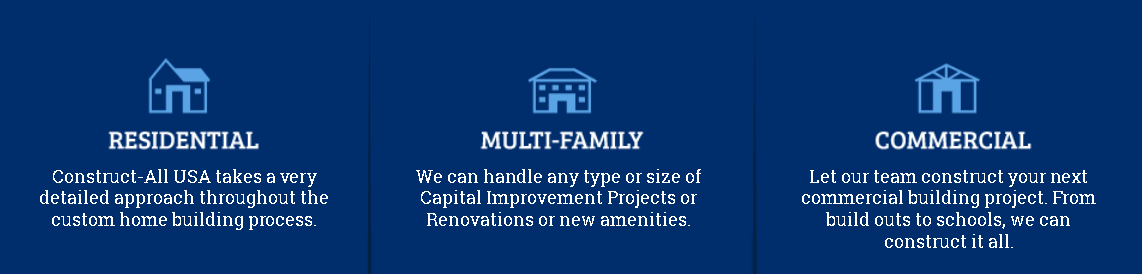 Construct-All USA, INC. was founded in 2007. Our team collectively has over 50 years experience in project management, roofing, new construction, home remodeling, commercial remodeling, and apartment complex construction projects. Construct-All USA, Inc has a regional presence, while headquartered in Murfreesboro, Tennessee with offices located in North Carolina, Mississippi and Alabama. We are licensed Insured and bonded in Georgia, Kentucky, South Carolina, Ohio, Texas, Missouri, Illinois, Indiana.